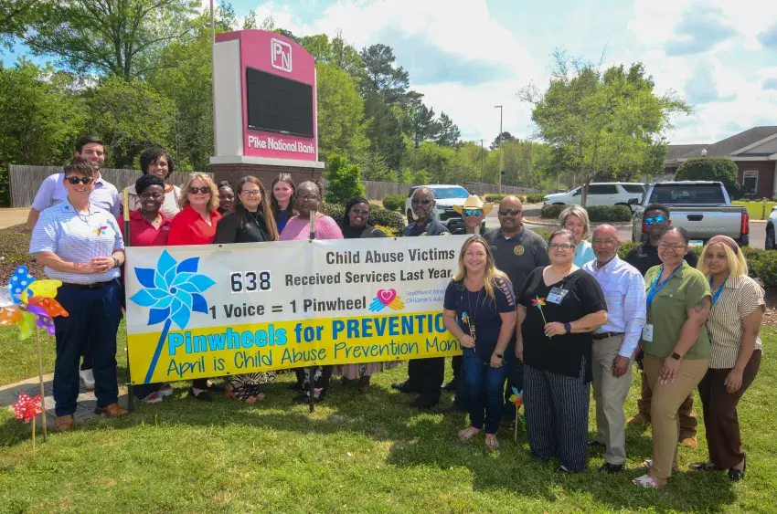 (Copyright 2026, Emmerich Newspapers, Inc. Photo by Matt Williamson) Local law enforcement, city and other officials join the staff of the Southwest Mississippi Children’s Advocacy Center to plant a pinwheel garden in honor of Child Abuse Awareness Month at Pike National Bank on Veterans Boulevard in McComb.