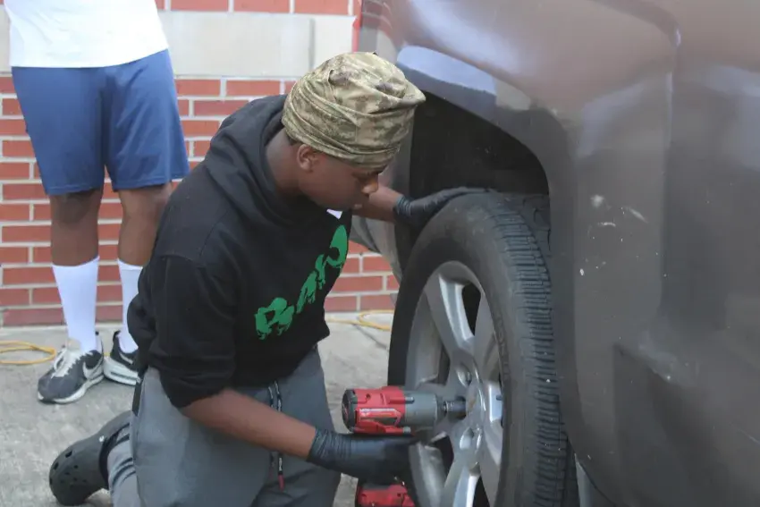 • Boys work on using power tools to tighten lug nuts while replacing a tire. (Photo submitted by Tanekia Galton. Copyright 2024, Emmerich Newspapers, Inc.)