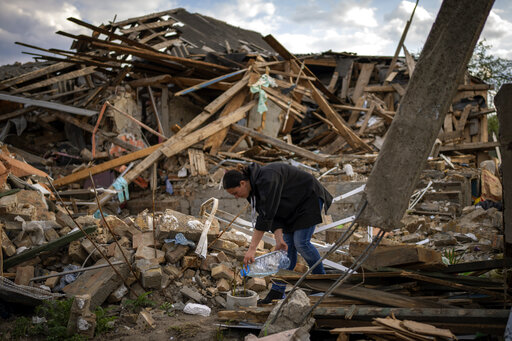 Anna Shevchenko waters the few surviving flowers outside her destroyed home in the Ukrainian town of Irpin on the outskirts of Kyiv. The house, built by the 35-year-old woman’s grandparents, was leveled during Russian bombing in late March.