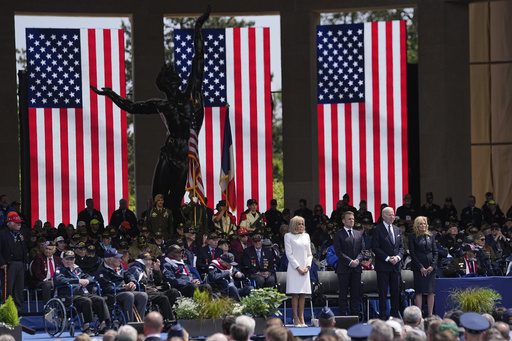 Before the ceremony, Biden and first lady Jill Biden met with more than two dozen American veterans near Omaha Beach, where the fiercest D-Day fighting took place. Those who could stand were helped out of wheelchairs to pose for photos. Most shook hands with Biden or saluted; one hugged him.