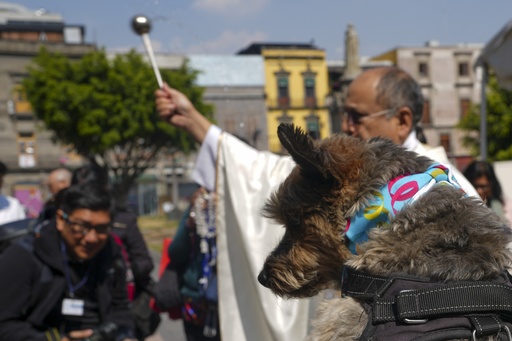 MEXICO CITY (AP) — Behaving at their best, a dozen dogs attended Mass at Mexico City’s cathedral Friday, waiting for their turn to be doused with holy water.