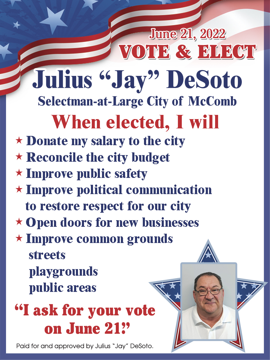 I will improve public safety and common grounds in McComb - streets, playgrounds, and other public areas.