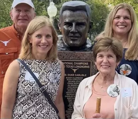 Duke Carlisle of McComb, left, the quarterback of the University of Texas 1963 national championship football team, is pictured with his family on campus Friday, Sept. 9, 2022 after the school honored its four title-winning teams by unveiling a bust of each quarterback that included a list of the team's players, trainers and assistants.