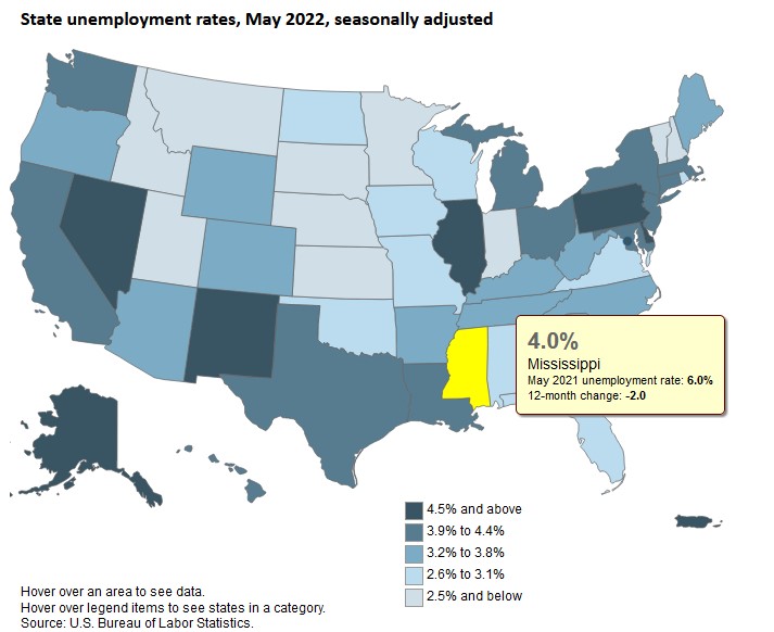 The current unemployment rate for Mississippi (as of May 2022) stands at 4.0 percent.