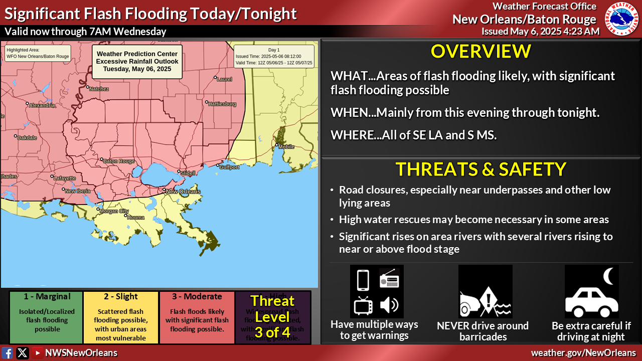 The National Weather Service in Slidell, La., said Wednesday morning that the threat of severe storms has increased, and heavy rain could lead to flash flooding today and tonight. That expectation decreases some on Wednesday, forecasters said.