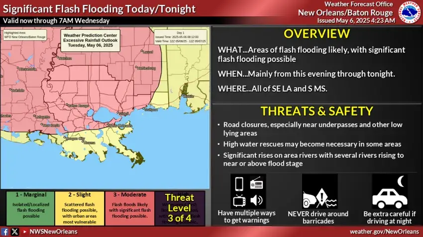 Areas at the greatest risk of flash flooding are along and north of the I-10 corridor, from New Orleans to the Gulf Coast and including Southwest Mississippi.