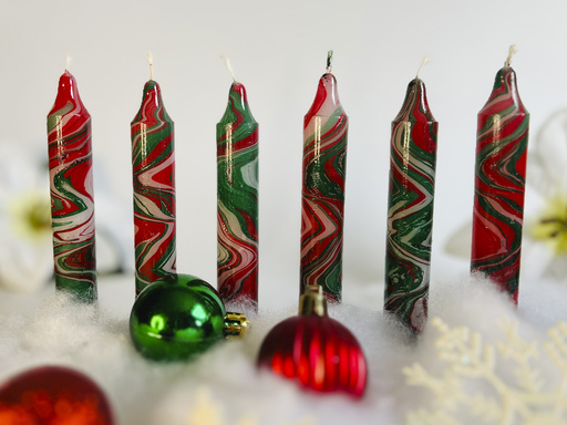 While marbleized candles — tapers, pillars or spheres — can decorate the home for Kwanzaa, traditional black, red and green candles are used in the holiday’s seven-candle Kinara, or candle holder. The Kinara is lit daily during the holiday’s seven days, from Dec. 26 to Jan. 1.