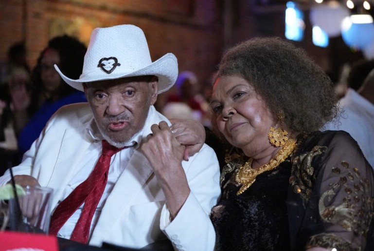 Kerry Kennedy, daughter of the late Sen. Robert F. Kennedy, right, poses for a photograph with James Meredith, left, who became the first Black student to enroll at the University of Mississippi in 1962, during his 92nd birthday celebration, Wednesday, June 25, 2025, at Hal and Mal’s in Jackson, Miss. Kennedy’s father when he was U.S. attorney general had sent federal marshals to escort Meredith into Ole Miss and negotiated with Gov. Ross Barnett to allow Meredith’s enrollment Credit: Rogelio V. Solis/Mississipp Today