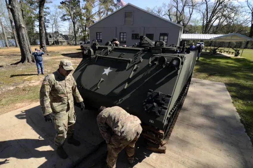 The M113-A2 armored personnel carrier, rendered useless for combat but made cosmetically pristine by military mechanics, reached its final destination at the McComb’s American Legion hut, where it was parked on a concrete pad on the south side of the building for permanent display.