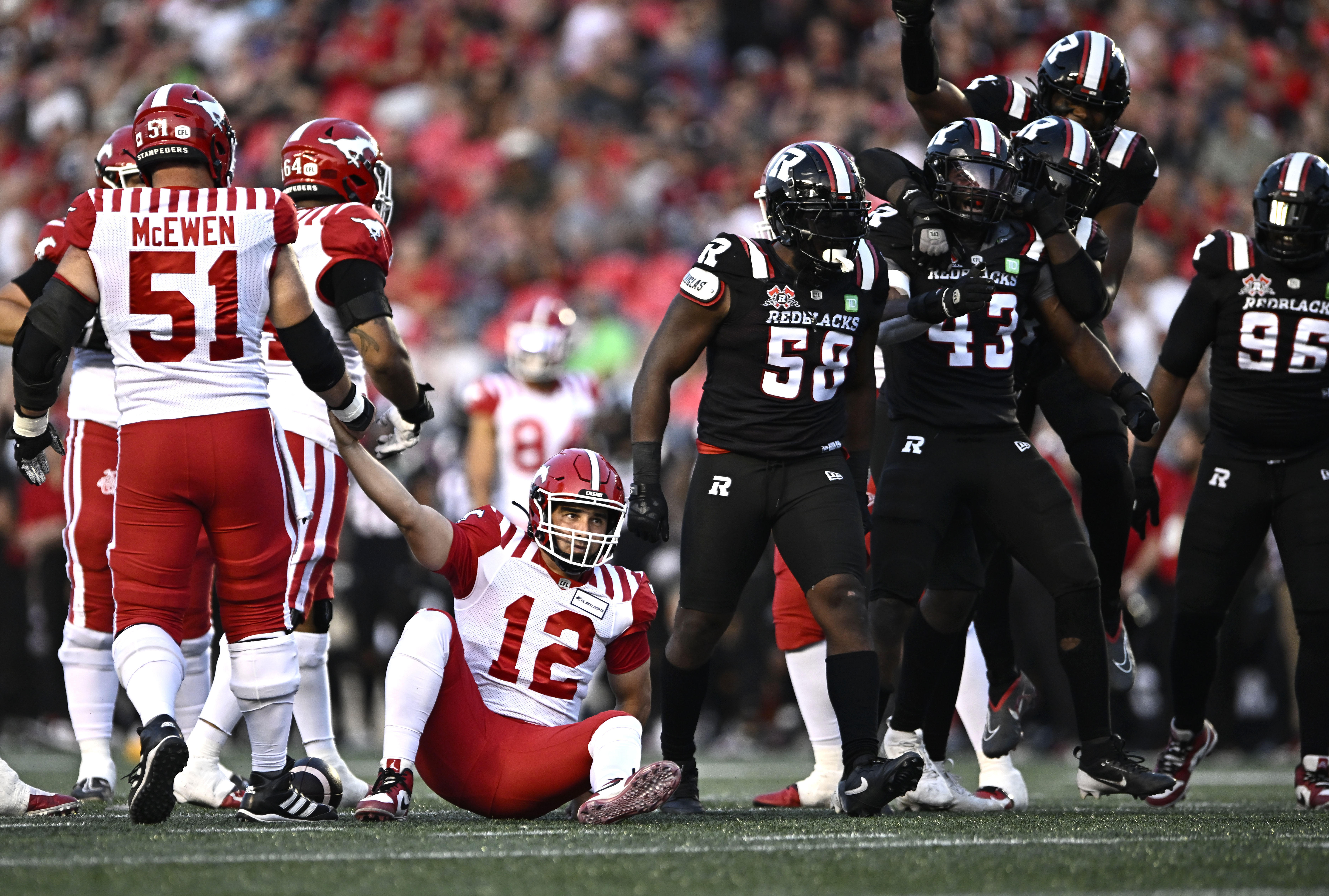 And, of course, the CFL has some different rules compared to American football. For instance, Canadian fields are 110 by 65 yards, with the midfield line being placed at the 55. A dozen players line up for each team on a given play, there are only three opportunities to gain a first down per possession and any offensive player can be in motion prior to the ball being snapped. Oh, and field goal posts are at the front of the end zone, not the back.