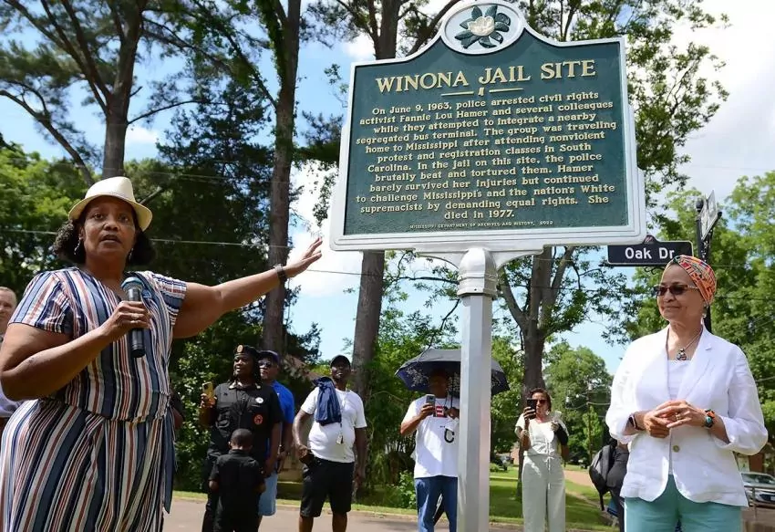 Jacqueline Hamer Flakes (right), daughter of Civil Rights activist Fannie Lou Hamer and Euvester Simpson (left), at the unveiling of a historical marker honoring Fannie Lou Hamer, Thursday, June 9, 2022. The marker is located at the former jail site where Hamer, Simpson and other voting rights activists were jailed and beaten in Winona. Credit: Vickie D. King/Mississippi Today