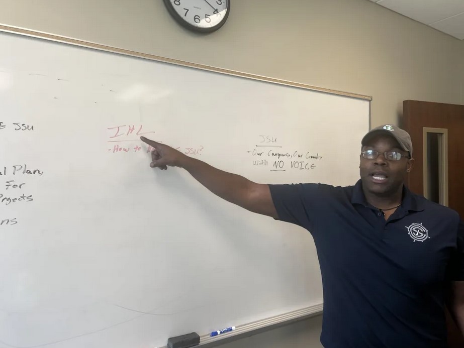 On a whiteboard, Pittman, a military veteran who graduated from the University of Southern Mississippi, wrote out his thoughts on IHL’s search process, which he referred to as “foolishness.”