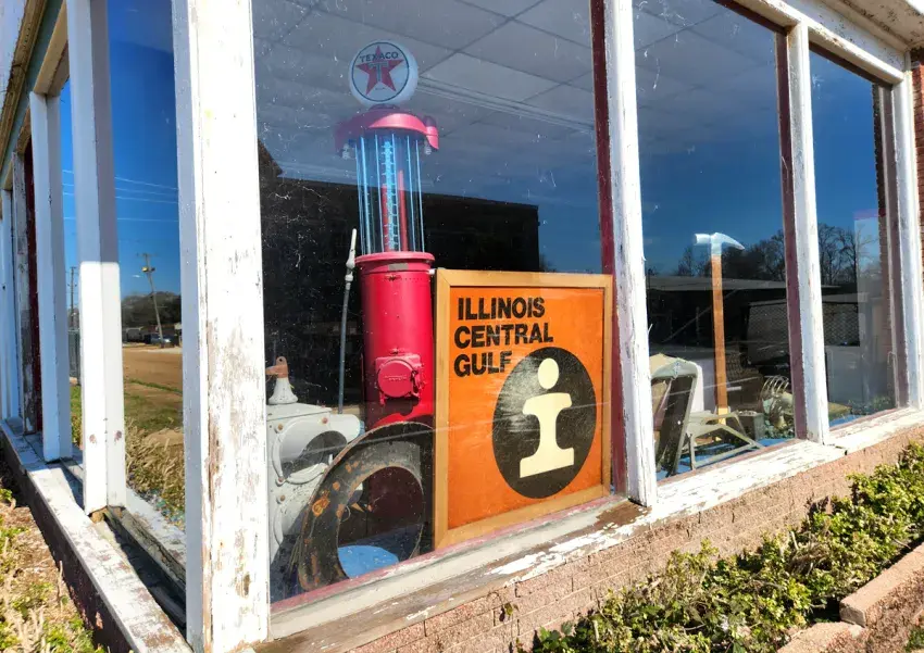 Photo by Jack Ryan. Copyright 2026, Emmerich Newspapers, Inc. A building on East Railroad Boulevard in Magnolia that's used for storage has an old-timey display in one window. An orange Illinois Central Gulf Railroad sign is up front, while behind it is a very old red gasoline pump with a white Texaco sign on top. At lower left, partly obscured by the corner frame of the building, is a retired traffic signal.