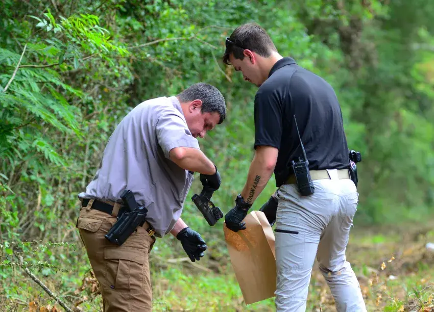 Pike County sheriff’s investigators Sean Umbrello, left, and Max Adams place a handgun into an evidence bag after finding it in a ditch on Higgins Drive in McComb on Tuesday afternoon. (Photo by Matt Williamson. Copyright 2025, Emmerich Newspapers, Inc.)