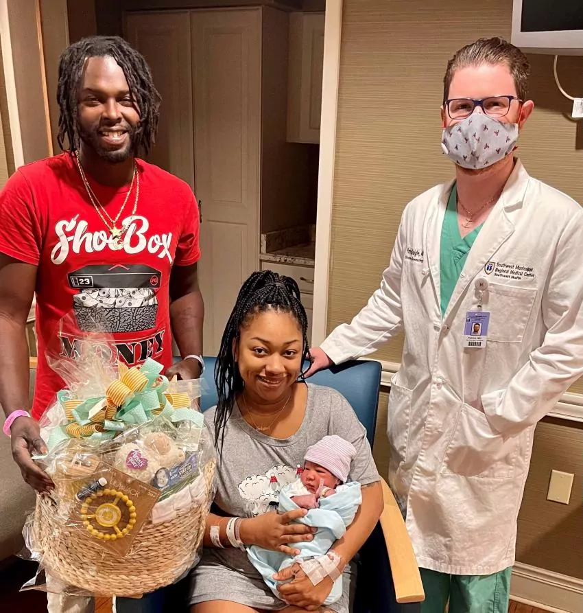 Kamari Hughes was born at 4:36 a.m. Jan. 3, making him the first baby born at Southwest Mississippi Regional Medical Center in 2022. He weighed 7 pounds, 12 ounces. He’s pictured with his mom and dad, Sabrina Wallace and Kameron Hughes of McComb, and Dr. Patrick Daigle, who delivered him.