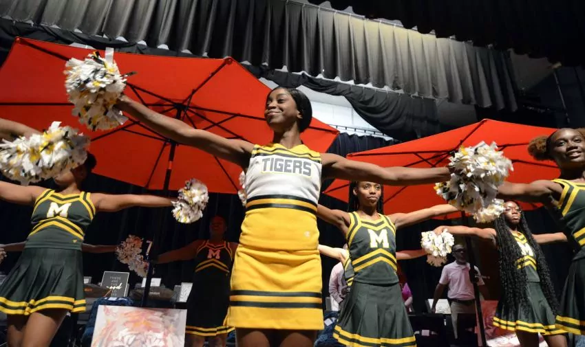 McComb High School cheerleaders perform during the McComb School District’s Rob and Nikki Belote Acceleration Festival Employee Block Party sponsored by the Partners in Education. (Matt Williamson | Enterprise-Journal)