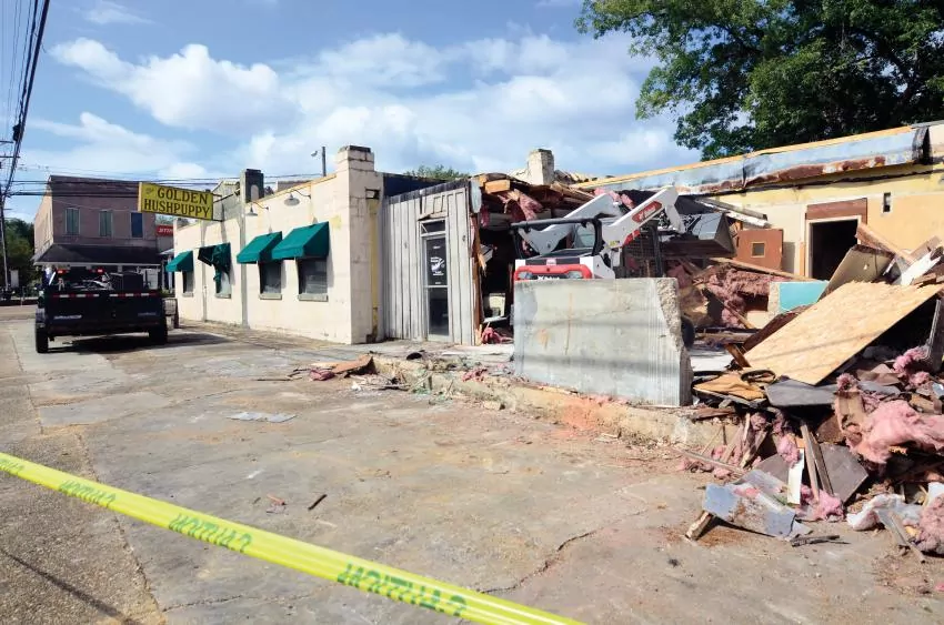 Demolition begins on the Golden Hushpuppy building in Summit on Tuesday.