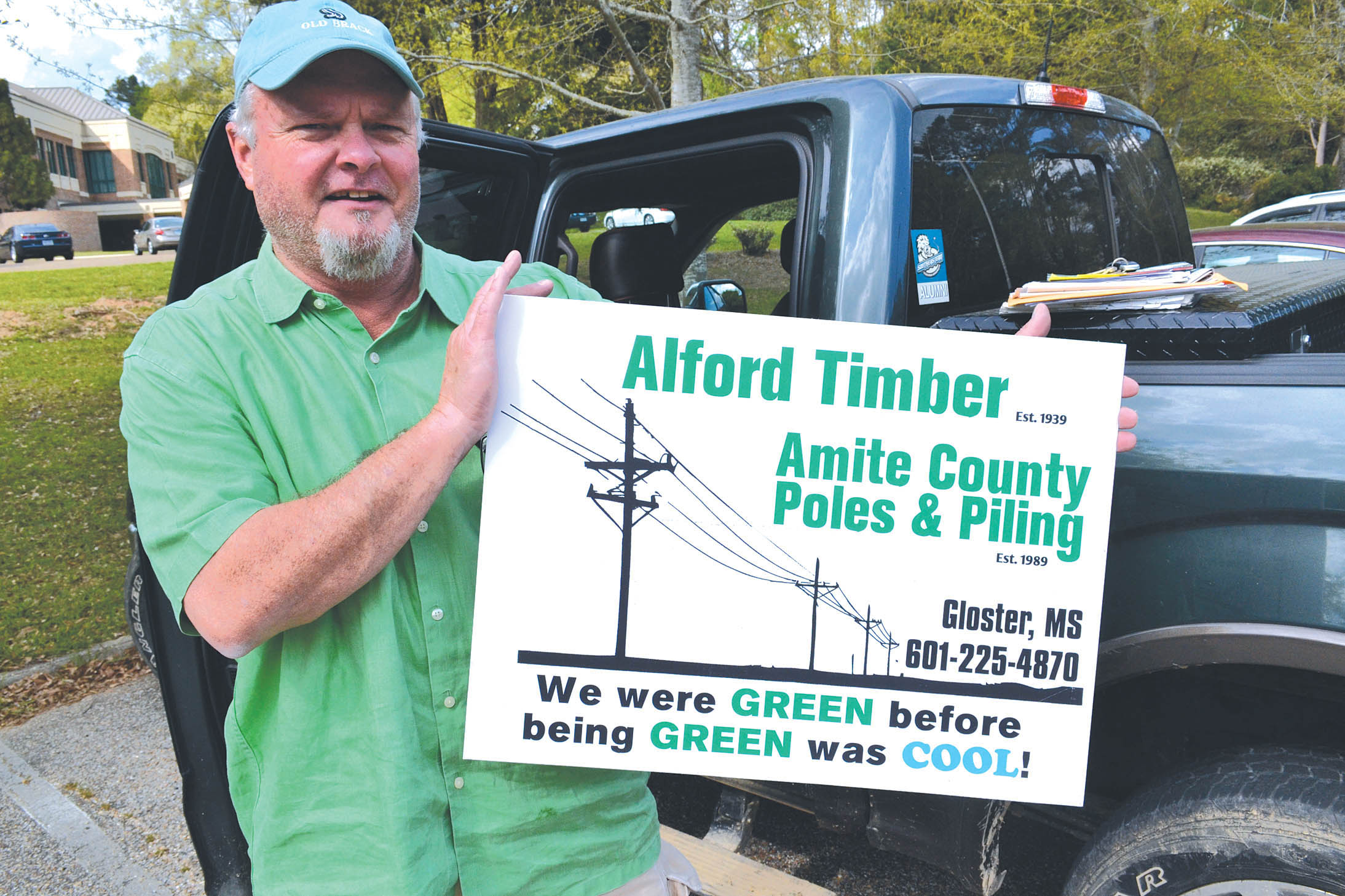 He has a sign that says “Alford Timber est. 1939, Amite County Poles & Piling est. 1989. We were green before being green was cool!”