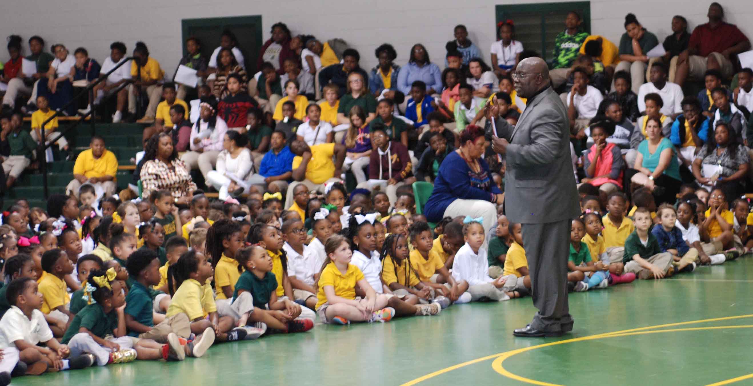 Roxie Baker, the Eva Gordon principal, was Thompson’s warm-up act, and she shared her own inspirational message. “The only thing that keeps you from being great is you,” she told the crowd of kindergarten-through-sixth-graders gathered to be motivated.