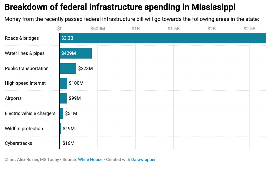 After months of negotiations, Congress passed the $1.2 trillion infrastructure package in early November, sending about $4.46 billion to Mississippi over the next five years.
