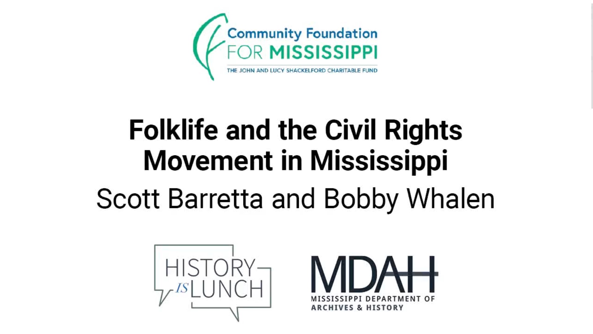 History Is Lunch is sponsored by the John and Lucy Shackelford Charitable Fund of the Community Foundation for Mississippi.