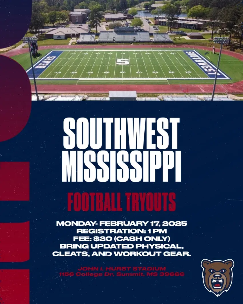 The Southwest Mississippi Community College football program will hold open tryouts at 1 p.m. on Monday, February 17 at John I. Hurst Stadium.