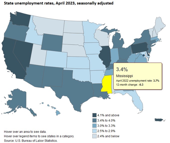 The current unemployment rate for Mississippi (as of April 2023) stands at 3.4 percent.