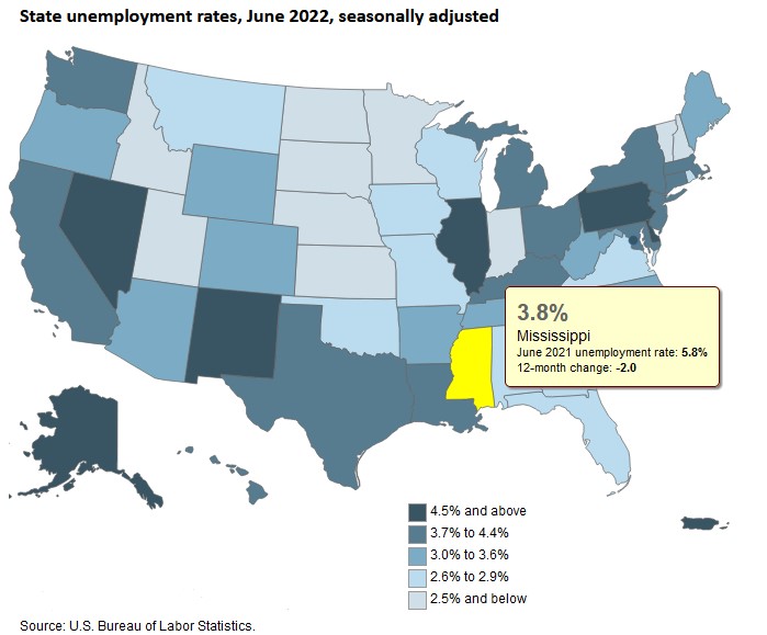 The current unemployment rate for Mississippi (as of June 2022) stands at 3.8 percent.