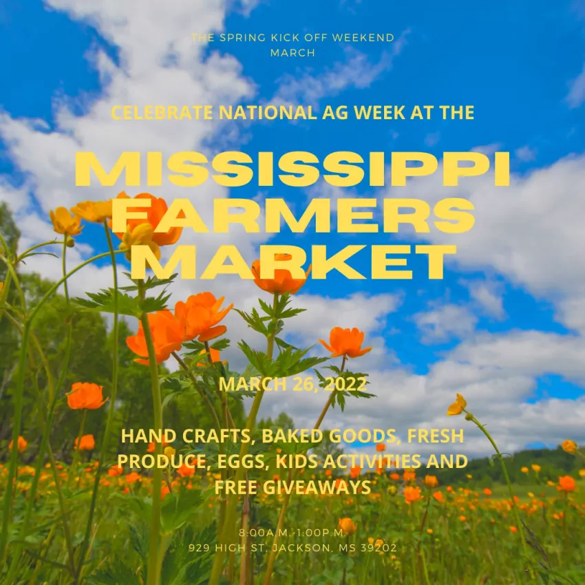 In conjunction with National Agriculture Week, the Mississippi Farmers Market is hosting its Spring Kick-Off on Saturday, March 26, from 8:00 a.m. until 1:00 p.m. In addition to the