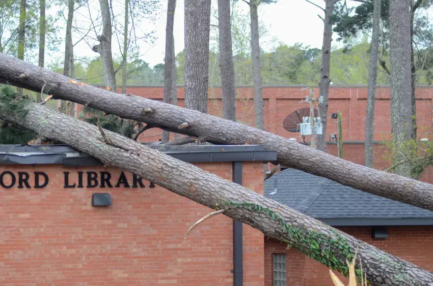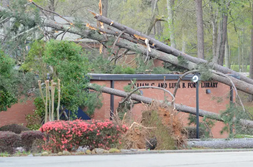 In addition to the library, trees fell on the new and old women’s dorms, the allied health building, the old men’s dorm, fencing around the football field and dugouts at the baseball and softball fields.