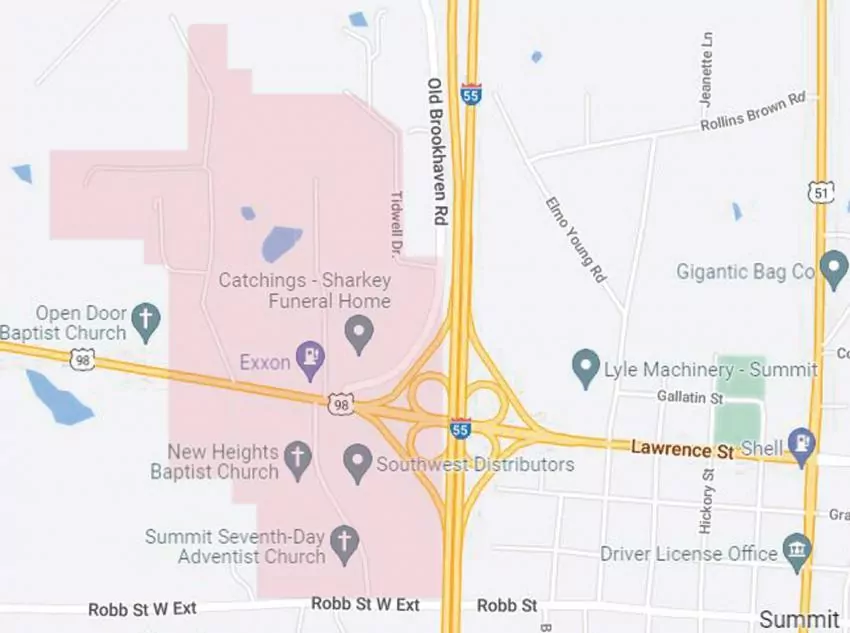 The area Summit is considering taking in is west of Interstate 55, starting at Robb Street Extension to the south and going north to include the Seventh Day Adventist Church, New Heights Baptist Church, Southwest Distributors and Shawn Mart. It would cross Highway 98 and go along Old Brookhaven Road and Tidwell Drive in the east and take in Buckey Moore Road and Greentree Lane in the west.