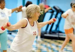 Around 40 adult women respond to the voice by counting one to 10 and stretching, followed by three claps.