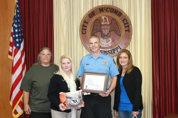 Kiki Byrd, left, and Michelle Lombas, second from left, honored McComb firefighter Jared Brister, second from right, Tuesday night for his off-duty bravery after volunteering to rescue two puppies with a fishing hook that had fallen deep into a well in the Sandy Hook community on Dec. 19, 2013.