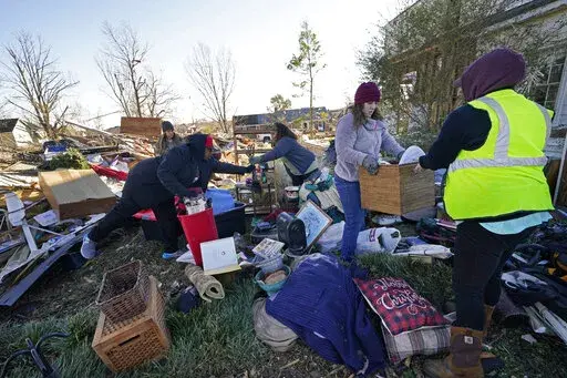 MAYFIELD, Ky. (AP) — Workers, volunteers and members of the National Guard were spreading across tornado-damaged areas of Kentucky to assist with recovery tasks ranging from replacing thousands of damaged utility poles to delivering bottles of drinking water.