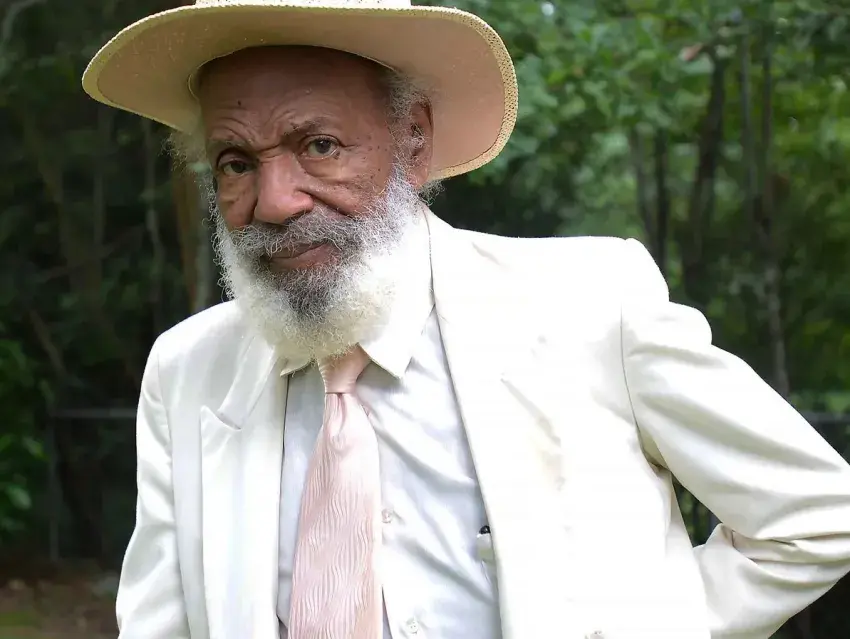 Activist and author James Meredith relaxes in the back yard of his Jackson home, looking dapper in an off-white suit and Panama-style straw hat.