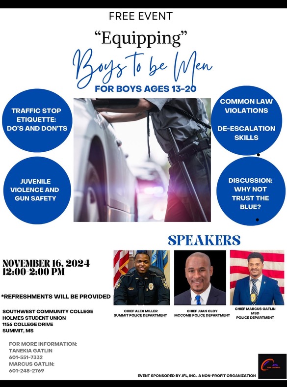 From noon to 2 p.m. on November 16, the JFL will host an event where speakers will talk about proper weapons safety, how to handle police interactions and the relationship between the police force and its community at Southwest Mississippi Community College’s Holmes Student Union.