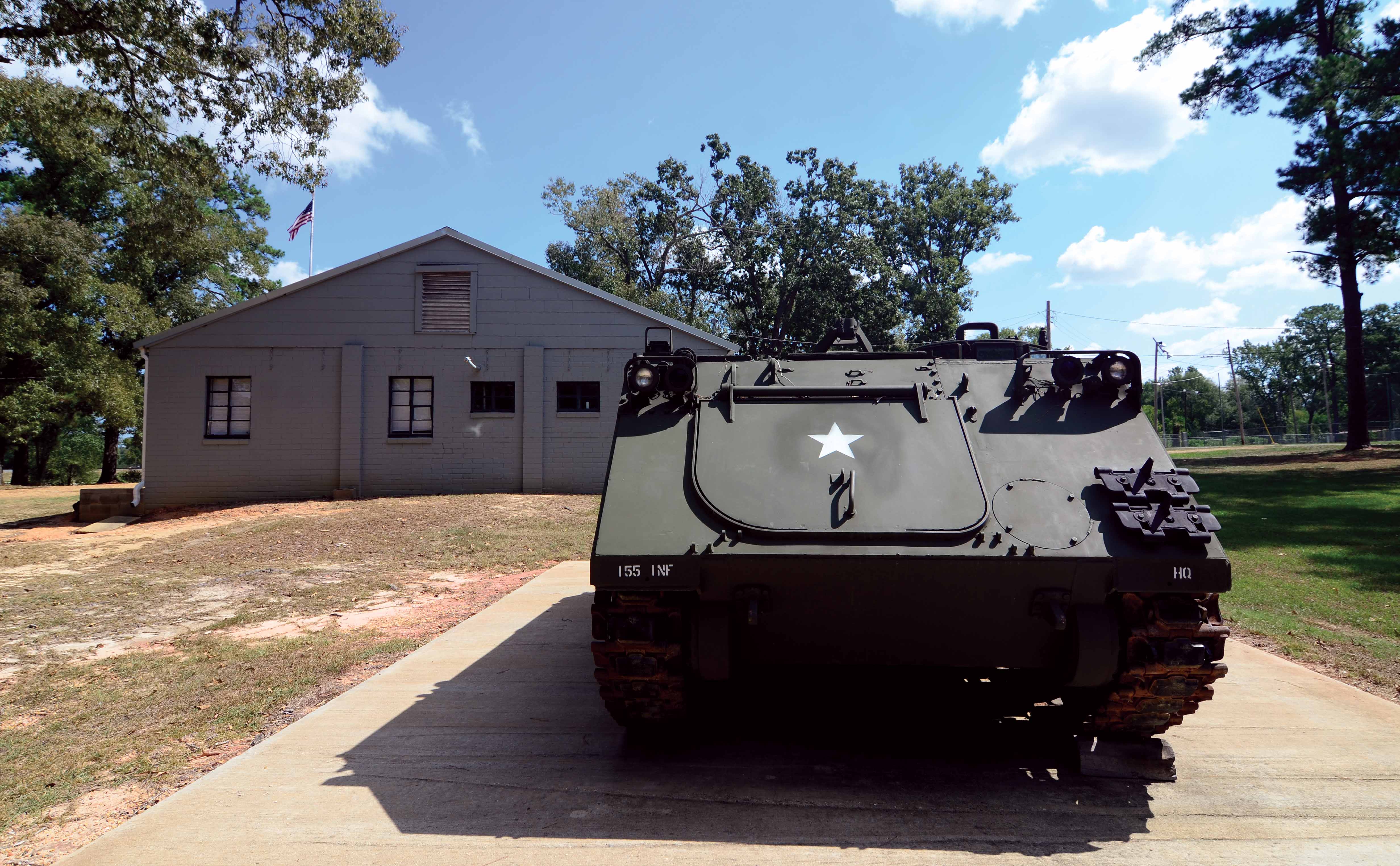 An armored personnel carrier is seen outside the city-owned American Legion Hut in McComb.