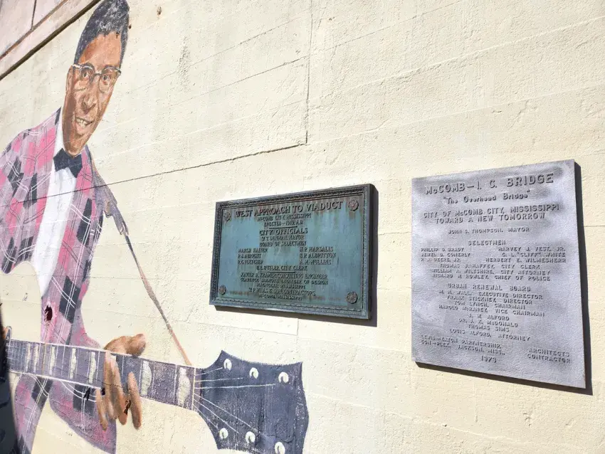 (Photo by Jack Ryan. Copyright 2026, Emmerich Newspapers, Inc.) Two plaques and a painting on the south side of the State Street bridge say a lot about McComb's history. At right is the commemoration of "The Overhead Bridge" construction, completed in 1973.